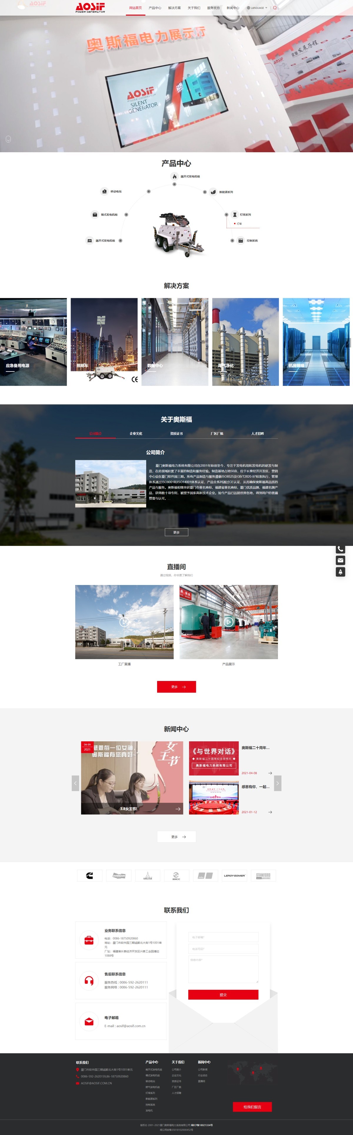 厦门奥斯福电力系统有限公司自2001年始创至今,专注于发电机组的研发与制造,在此领域积累了丰富的制造和服务经验。制造基地占地50亩,产品制造与服务遵循ISO8528及GB/T2820-97标准执行,管理体系通过ISO9001和ISO14001体系认证,产品全系列通过CE认证,从而确保奥斯福高品质的产品与服务。奥斯福相继荣获厦门市著名商标和福建省著名商标,获得数十项专利,被授予高新技术企业。如今产品已远销世界各地,得到用户的普遍赞誉与认可。